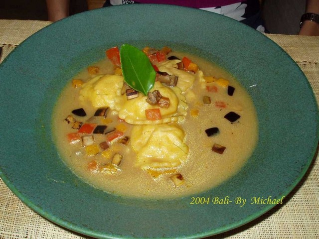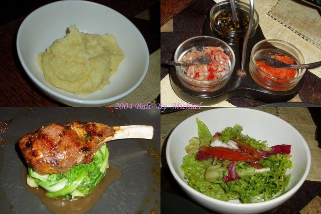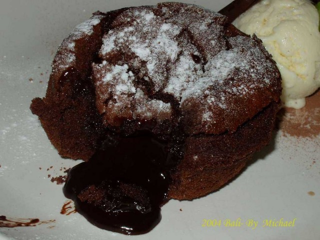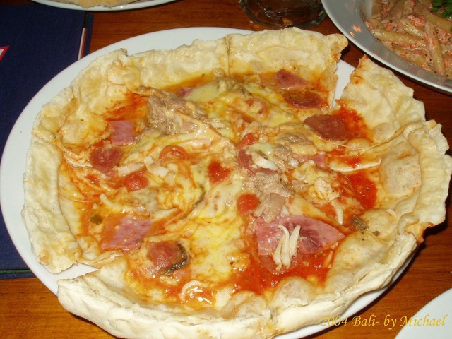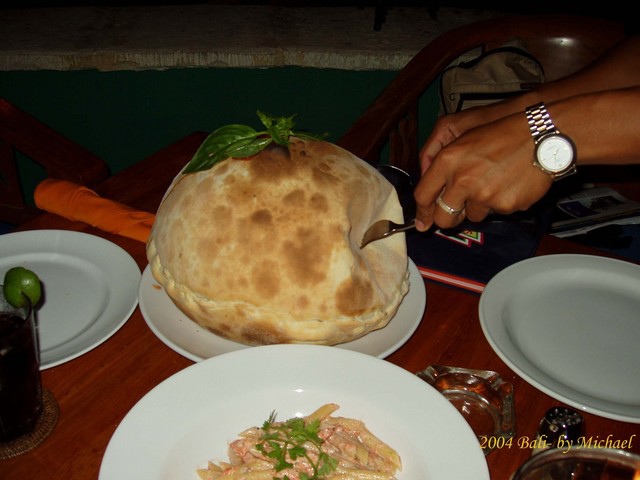 Papa’s Café’是位於Kuta 海邊的一家餐廳,和峇里島眾多出名的餐聽相同,Papa’s Café’招牌相當小,不過如果經過這裡應會被餐廳裡滿座的狀況吸引。晚餐我們點的是一份火山Pizza,一份義大利麵。火山Pizza 幾乎已是這家餐廳的招牌菜,剛剛上桌時就有如左上圖所示,像是一座爆發的火山,待上桌後,店員會幫你切開,亮出裡面熱騰騰的Pizza 餡。鮭魚義大利管麵味道也還不錯,不過我們還是喜歡濕潤一點的麵。