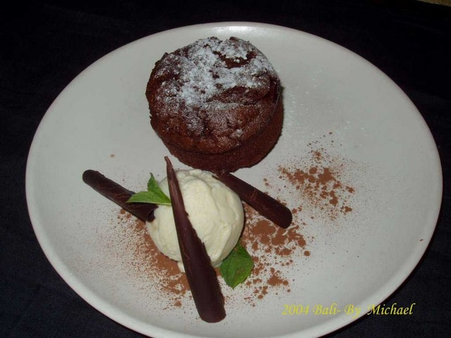 在這裡不想吃得太飽,免得影響晚餐,我們點了一份套餐,再加點了一份主菜,份量都不會太多,中午吃剛剛好。南瓜湯是涼的,剛好配合炎熱的天氣,有開胃的效果﹔羊排很嫩,而且不帶血,火侯恰到好處﹔不過南瓜餃有一點甜甜的,比較不習慣這樣的口味﹔甜點是巧克力蛋糕,蛋糕內加入了苦甜的巧克力醬, 配上一球冰淇淋,也是相當好吃(這種搭配讓我們想起在澳洲吃的甜點,不過Ary’s Warung 的比較精緻。)