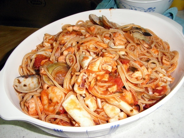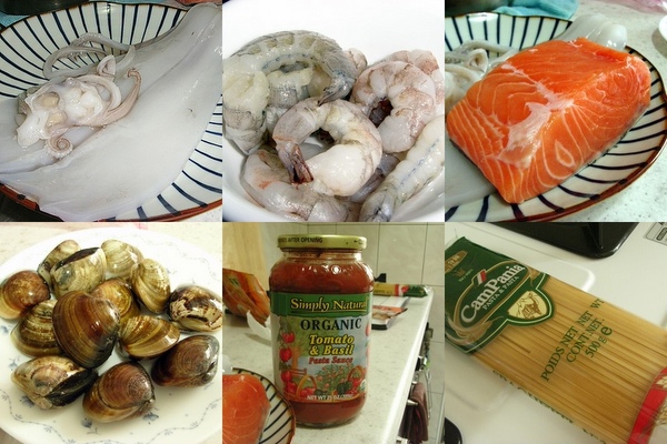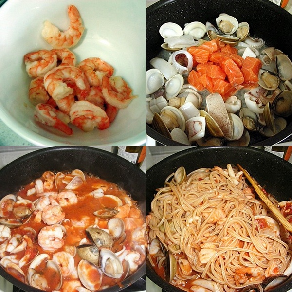 蝦仁先炒熟置於一旁,蛤蠣再下鍋用白酒去炒(其實算是煮了,只是沒加水),等到蛤蠣快要開了在放進鮭魚等食材,最後加入蕃茄醬料,開小火,慢慢讓食物與番茄混合,最後再加入滾水煮三分鐘的義大利麵,充分拌勻入味後,就可起鍋了。