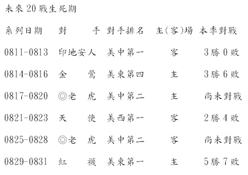 洋基好日子過完了,休息1天後,就要進入暴風圈,能不能晉級季後賽,未來這20戰很關鍵。 明星賽後洋基的對手其實不強,大多是已無希望晉級季後賽的隊伍,包括魔鬼魚及皇家這兩支分區墊底球隊,洋基打者受到的考驗不大,投手受到的挑戰也不強,所以近21戰他們能打出15勝6敗的佳績,明星賽後的28場比賽總共是20勝8敗,這也就是為什麼洋基在短短1個月內能從淘汰邊緣追到在美聯外卡只差領先者半場勝差的原因。 未來的20戰才真正是考驗的開始,因為,洋基要面對的將是美國聯盟最棒的隊伍,面對美國聯盟最棒的投手,就像今天面對的藍鳥隊哈勒戴一樣。 這包括紅襪的貝奇特(14勝)、松坂大輔、威克菲爾(13勝);印地安人沙巴西亞(14勝)、卡摩納(13勝)、柏德(10勝);老虎的瓦蘭德(11勝)、邦德曼(10勝);天使的雷奇(14勝)、艾斯柯巴(11勝);就算金鶯也有一個12勝投手貝達德。 面對這樣的投手陣容形成的暴風圈,洋基想要能全身而退,順利推進,難度很高。 當然,洋基目前棒子正燙,但從另一個角度來說,是不是因為對方投手實力不強,所以洋基才能打得這麼順?今天面對哈勒戴這個ACE級投手,馬上急速冷凍,全場只有7支安打,若非卡諾雙響砲打下3分打點,洋基搞不好只得1分。 哦,有人會說哦,哈勒戴專剋洋基,不能這樣比。嗯,也有點對啦。連今天之勝,哈勒戴生涯對洋基戰績10勝4敗,對洋基確實有一套。 不過,洋基確實讓人擔心,且看他們未來20戰的對手,除了老虎隊本季還沒有碰過頭外,其他4隊洋基在本季已交手的比賽中都居下風,對金鶯3勝6敗,對天使2勝4敗,對紅襪5勝7敗,只有對印地安人有3勝0敗的佳績。 最重要的是對老虎的兩個系列戰,總共8場比賽,老虎目前跟水手隊在外卡榜上分居1、2,兩隊無勝差,這兩個系列戰若洋基能搶到優勢,對晉級季後賽會有幫助。 基本上,目前各路專家對洋基是否能擠上季後賽,仍在存疑階段,綜合各家看法,洋基應算是仍有希望,但處境危險的一隊,尤其王建民今天的崩盤,更成為洋基的一大隱憂。