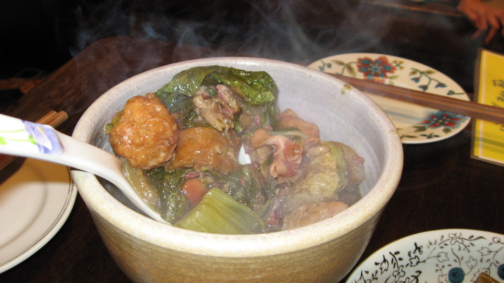 這道燉煮什錦菜有點像是家常的"佛跳牆",肉丸子、豆腐、鵪鶉蛋等食物拿來紅燒。熱騰騰的,吃起來相當好吃。