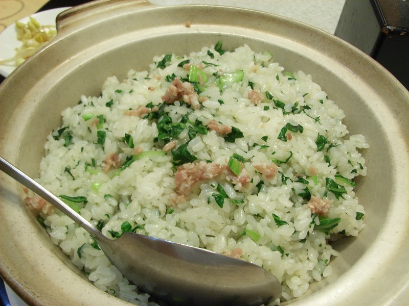 上海菜飯,炒熟的青江菜及火腿,拌入飯中,