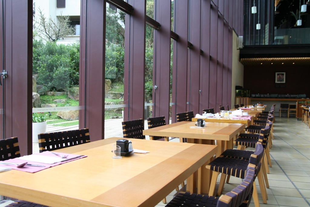 早餐本應選擇雲天的自助早餐(只到10:00),但是睡得太晚的緣故,我們只好改吃岩波庭的早午餐。店裡客人並不算多,大概大家去吃雲天的早餐了。岩波庭的擺設,跟雲天沒有太多不同,連餐廳設計的感覺都很類似,挑高的門廳讓採光非常良好。岩波庭強調的是Fusion料理,意思就是讓你搞不懂是哪一國的料理。從照片中遠遠的可以看到料理台,有身著日本料理師傅衣服的人在其中,或許也可以把岩波庭視為"創意日本料理"。