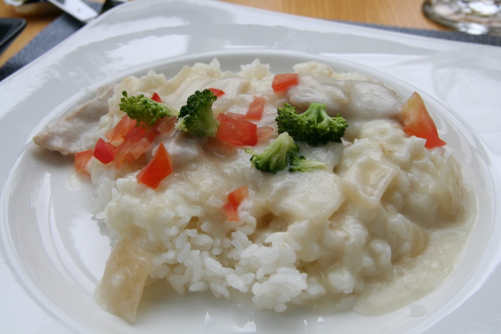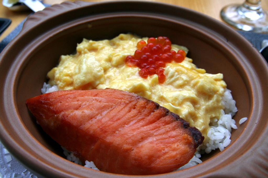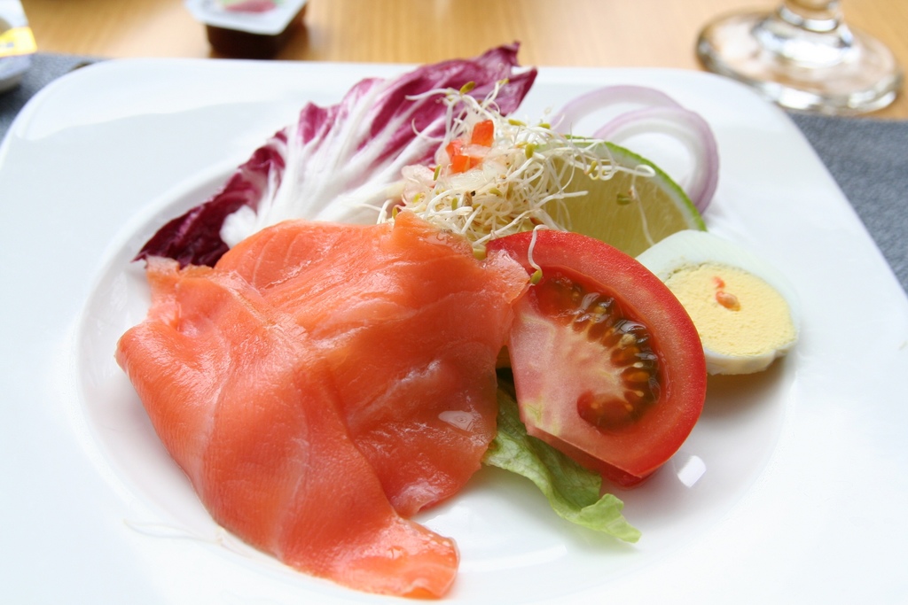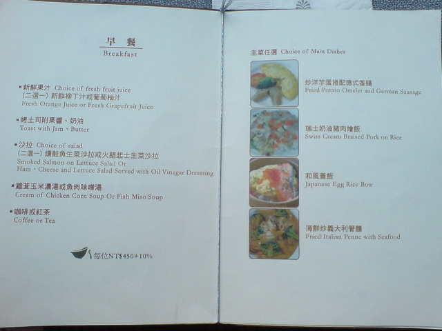 菜單上,有多種選擇可以自由搭配,我特別選了燻鮭魚沙拉,而我們一行三人各自選了不同的主菜,分別是炒洋芋蛋捲配德式香腸、和風蓋飯、瑞士奶油豬肉燴飯,想要看看哪一種比較好吃。