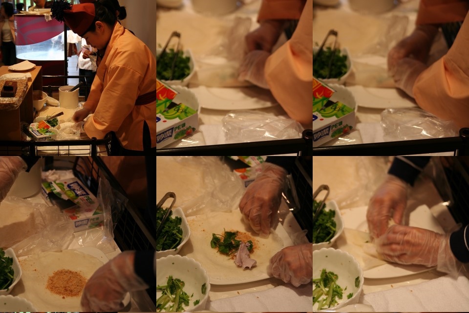 做法並不難,像是上面所示範的,將薄潤餅皮攤平,放上花生糖,在將小黃瓜、一小口冰淇淋放在上面,捲起來以後,就成了好吃口味特別的小點心。