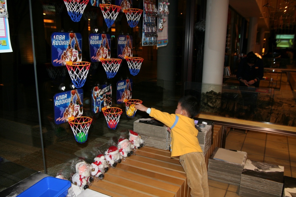 市集還有我們家小朋友最愛的籃球九宮格,本來是要站在指定距離投球的,但是關主特別通融祺祺以近似灌籃的方式投球,所以命中率特別高。