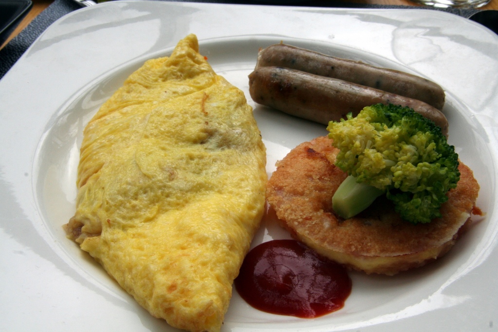 早餐本應選擇雲天的自助早餐(只到10:00),但是睡得太晚的緣故,我們只好改吃岩波庭的早午餐。店裡客人並不算多,大概大家去吃雲天的早餐了。岩波庭的擺設,跟雲天沒有太多不同,連餐廳設計的感覺都很類似,挑高的門廳讓採光非常良好。岩波庭強調的是Fusion料理,意思就是讓你搞不懂是哪一國的料理。從照片中遠遠的可以看到料理台,有身著日本料理師傅衣服的人在其中,或許也可以把岩波庭視為"創意日本料理"。