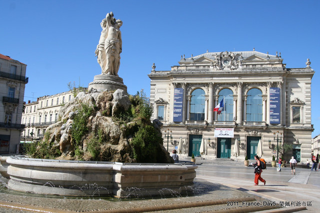 這裡是喜劇廣場。廣場中的是三女神噴泉(Fontaine des Trois Graces),建於1796年。後方的建築物就是Opera Comedie。