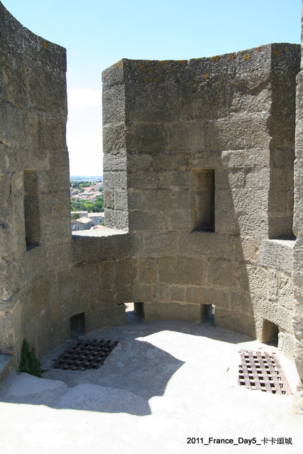 這是外牆的瞭望台,設計是有用意的。牆壁上的洞可以放箭,腳底邊的洞可以丟火跟熱油;就算這一層被攻進來了,這個 地方對於內城來說也毫無死角,很容易被內城的守軍發現。
