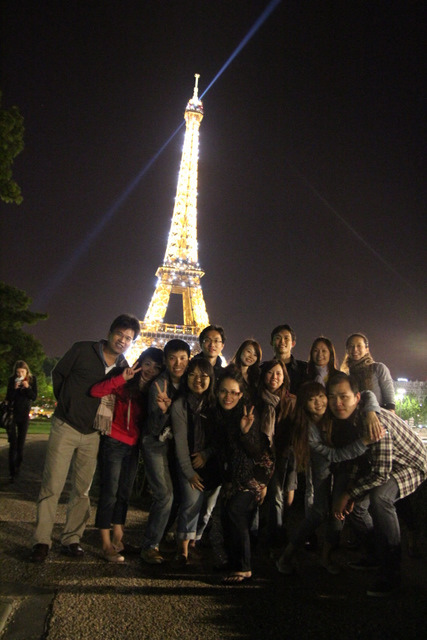 要去巴黎鐵塔拍夜景完全是臨時起意的,不過到最後來參加的朋友共有14位,所以拍起團體照也頗為壯觀。因為是夏天,所以巴黎要等到完全天黑大概要到10點之後,我們大概也在那個時間集合出發,前往幾個小時前才去過的巴黎鐵塔。